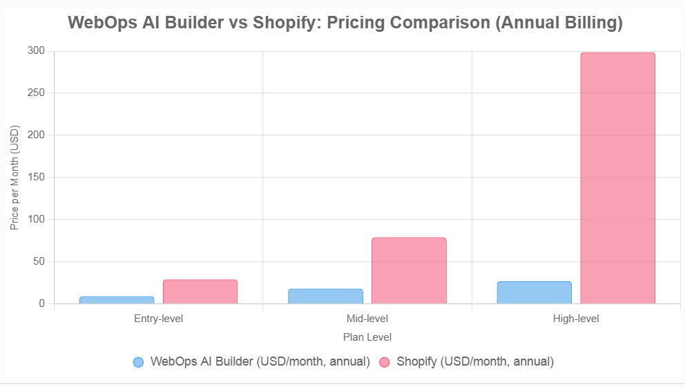 The chart at the beginning of this article visually compares the annual pricing, highlighting WebOps’ cost advantage at lower tiers and Shopify’s higher investment for advanced features.